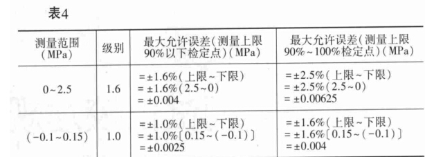 JJG52-2013中規定,壓力表的示值誤差應不超過JJG52-2013中表1所規定的示值誤差,由于壓力表誤 差使用的是引用誤差,這句話理解起來就是壓力表每 個檢定點測量上限的90%~100%的檢定點除外的示 值誤差都不超過固定的按壓力表標明的級別計算的 最大允許誤差值,測量上限的90%~100%的檢定點最 大允許誤差按標明級別的低一級別計算。規程中表1 注2規定,壓力表的最大允許誤差按其量程的百分比 計算。壓力表最大允許誤差的計算通過舉兩個典型測 量范圍例子說明見表4)。