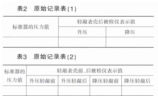 時,從零點開始均勻緩慢地加壓至第一個檢定點即 標準器的示值),然后讀取被檢壓力表的示值按分度 1/5估讀),接著用手指輕敲一下壓力表外殼,再讀 取被檢壓力表的示值并進行記錄,輕敲前、后被檢壓 力表示值與標準器示值之差為該檢定點的示值誤差。 由此可見,某點的示值誤差需要記錄輕敲前后的示值 并減去標準壓力值,而規程附錄A中只設計了記錄輕 敲表格后的示值,這就造成最大示值誤差不太好計 算,甚至造成從原始記錄中不能反映實際的最大允許 誤差,建議把該部分原始記錄表2樣式改為表3樣式。