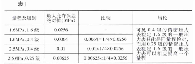 1) 按照JJG52-2013彈性元件式一般壓力表、壓 力真空表和真空表檢定規程》.1.1節對標準器的要 求,標準器的最大允許誤差的絕對值應不大于被檢表 最大允許誤差絕對值的1/4,0.4級精密壓力表無法完 成對1.0級一般壓力表的檢定,或者需要多只0.4級精 密壓力表才能完成對一只壓力表的檢定,非常不方 便,如果客戶有一批壓力表要送檢其中包含1.0級 便無法滿足客戶要求。2)對于市場上比較普遍的壓 力表,根據7.1.1對標準器的要求,0.4級精密壓力表只 能檢定同樣量程的1.6級壓力表,而0.25級的精密壓力 表檢定1.6級的壓力表可提高一個量程,這樣在對壓 力表測量上限值的檢定時就不需要把精密壓力表也 升壓到上限值,對保護精密壓力表大有好處,特別是 對于使用頻繁的精密壓力表,可延長其使用壽命。舉 例如表1所示。