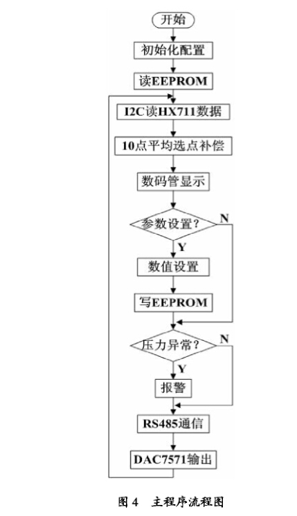 智能氣體壓力表主程序主要包括壓力采集、 10點(diǎn)平均選點(diǎn)補(bǔ)償、數(shù)碼管顯示、異常報警、 DAC7571模擬量輸出、RS485通信、按鍵掃描和 EEPROM子程序模塊。主程序流程圖如圖4所示。