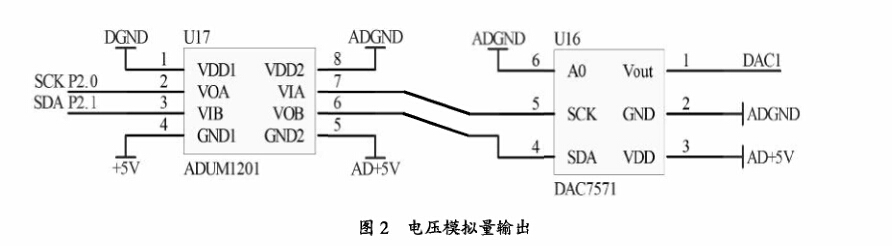 智能氣體壓力表具有模擬量DAC輸出功 能,可直接輸出0—5 V模擬量電壓信號,單片機(jī)與DAC7571通過I2C總線進(jìn)行數(shù)據(jù)傳輸,通過 ADUM1201實(shí)現(xiàn)單片機(jī)與DAC7571外部電氣隔