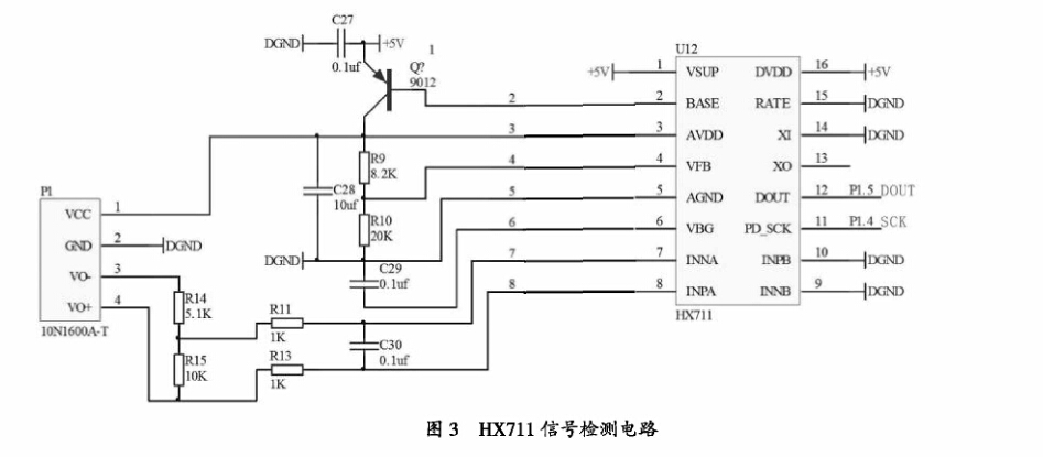 10N1600A-T壓力傳感器滿量程輸出電壓 100 mV,HX711傳感器A通道最大輸人電壓在 通道增益為128時輸人電壓為±20 mV,通道增益 為64時輸入電壓為±40 mV,即在壓力傳感器輸 出信號端進(jìn)行電.祖分JS,保證輸出:信號在HX711 通道A允許輸入范圍,單片機(jī)與HX711通過I2C 總線進(jìn)行數(shù)據(jù)傳輸s。