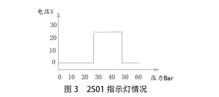 (1)首先檢查壓力開關2S01 ,將數字壓力表的測針連接到測 壓節點2T01 (圖1)處,將風機 復位后,記錄其壓力值變化及2 點(圖2)處電壓變化,其記錄 如下圖(圖3)所示,在風機復位時沒有發出剎車制動指令時其2S01 的2點(圖2)處無24V電壓,說明問題出現在壓力開關2S01處。通 關觀察發現,壓力開關2S01本體的電壓隨著壓力的變化是符合其特 征曲線的,說明壓力開關2S01本體正常。由于通過減壓閥2V01的壓 力高于32Bar,則可以說明減壓閥2V01巳經失效。