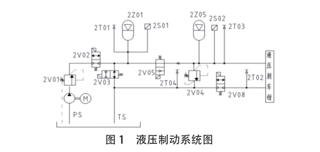 制動系統由液壓站動力單元通過減壓閥(2V01)提供動力,蓄能 罐(2Z01)保證在系統動力單元失去壓力時仍能進行制動操怍。減壓閥 (2V01)出現故障或蓄能罐(2Z01和2Z05)過度加熱時安全閥(2V04)可 以防止制動系統內壓力過高造成液壓元件損壞。壓力開關(2S01)用于 檢測制動蓄能罐(2Z01)內的壓力,壓力開關(2S02)用于檢測制動壓力。