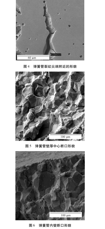 從金相組織的分析來看,彈簧管中裂紋是沿 軸向延伸,裂紋斷口的金相組織為奧氏體,試樣腐 蝕后內壁晶界明顯,說明受管內的介質腐蝕和內 壓影響,裂紋是沿晶擴展的。