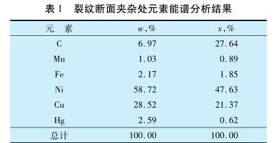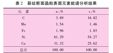 對裂紋斷口的晶粒表面進行能譜分析,結果 見表2??梢姡荚赝?,其他元素的含量與基 體相近,未檢測到汞的存在。