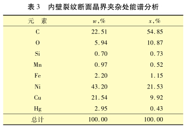 首先對壁厚中心裂紋斷口的晶界夾雜處進行了能譜分析,結果見表1。由表1可見,壁厚中心 晶界夾雜物處含有汞和其他金屬基體元素,其中 碳元素屬于基體中的碳化物。汞元素不屬于基體 金屬元素,應是其接觸的天然氣含的汞。