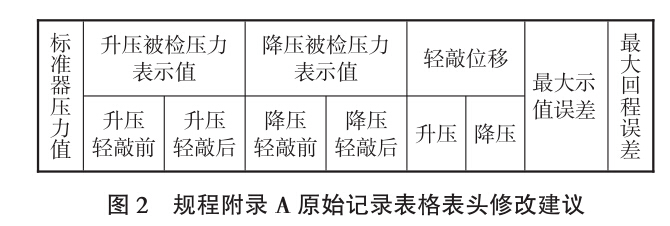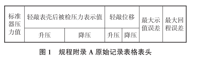 一般壓力表的檢定中,必檢項目有6個,其 中,示值誤差和輕敲位移這2個檢定項目,都涉及 到輕敲前的被檢壓力表示值。JJG 52—2013規定: 檢定示值誤差時,示值誤差為升壓或降壓時輕敲表 殼前、后4個被檢壓力表示值分別與標準器示值之 差;輕敲位移檢定時,同一檢定點輕敲壓力表外殼 前與輕敲壓力表外殼后指針位移變化所引起的示值 變動量即為壓力表的輕敲位移數。由此可見,在這 2個檢定項目中,輕敲表殼前的壓力表示值舉足輕 重,但是這一重要數據,在規程附錄A原始記錄 表格中卻沒有預留填寫位置。規程附錄A原始記錄表格表頭,如圖1所示。