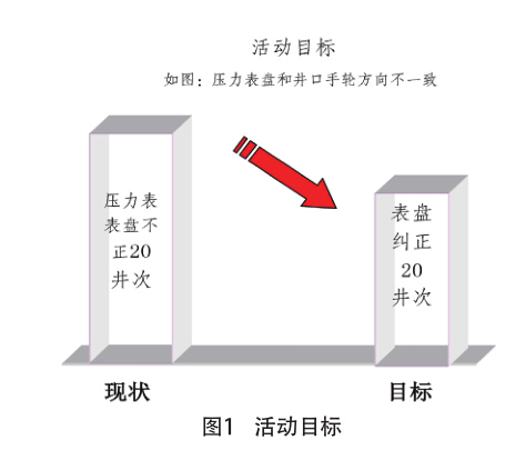 由于有些井壓力表表盤的方向不一致,也不規范, 造成錄取資料有誤差,工作量加大,同時帶來安全工 作隱患,所以我們選擇了此課題,做為今年我們小組活 動的目標。