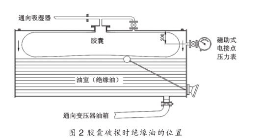 當膠囊破損時,空氣通過膠囊進入到儲油柜油 室,油室與膠囊內部(大氣壓)氣壓逐漸平衡,油室內 的絕緣油流動到膠囊下方;由于絕緣油油位的下降, 從而使壓力表處的油壓降低。此時,壓力表內的布爾 登彈簧旋轉,進而觸發開關觸點,由此發出報警信 號,如圖2所示。