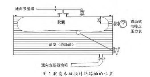 在儲油柜端部安裝一個磁助式電接點壓力表, 位置距離油室頂部0.2m。當膠囊未破損時,儲油相 油室內充滿了絕緣油,此時,壓力表顯示一個恒定的 油壓,如圖1所示。