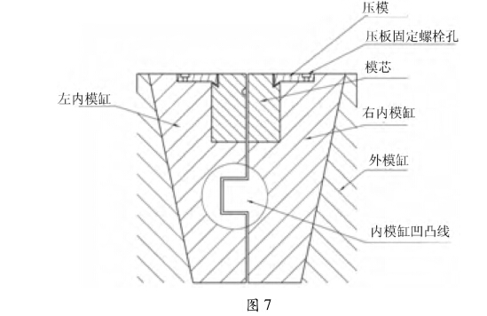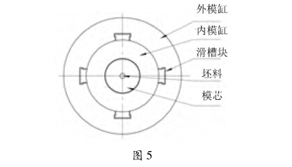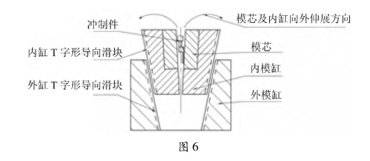 設(shè)計的模缸由外模缸、內(nèi)模缸及模芯組成,俗稱 抽芯模,如圖5所示。下模的模芯鑲嵌在內(nèi)模缸里 并固定,兩塊模芯用縱向橫向凹凸槽直銷鎖定,內(nèi)模 缸分成左右兩塊,與模芯一樣匹配相鑲成一體,內(nèi)模 缸與外模缸的接觸面互成10° ~12°的傾斜,內(nèi)模缸 分四方各成90°角的位置直接割成4條T字形滑動 長塊作為導(dǎo)軌,與其相對應(yīng)的外模缸切割成T字形 導(dǎo)向長槽,導(dǎo)軌在導(dǎo)槽內(nèi)可上下滑動。滑塊滑槽既 起導(dǎo)向作用,又起定位作用。4條導(dǎo)向塊、槽,使用 中只用對應(yīng)兩條,磨損到一定程度,相互換位,可延 長一倍的模具壽命。工作時內(nèi)模缸與模芯在脫模時, 沿著T字滑槽上行,并按模缸的傾度向外伸展,自然 形成脫模。取出制件后,模芯與內(nèi)模缸沿T字滑槽向 下并向內(nèi)閉合,再進行第二次沖壓,如圖6所示。