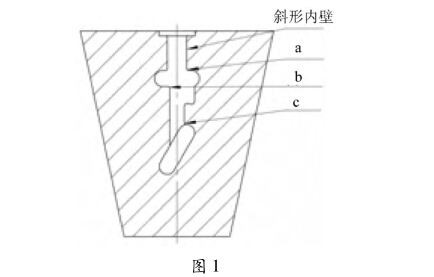由于壓力表接頭形狀復(fù)雜,有許多形狀不同的 拐角,如圖1中所示的角a、b、c,這種轉(zhuǎn)角在紅沖過 程中阻尼大往往形成死角,坯料無法到位。而無轉(zhuǎn) 角或平行的地方,金屬過多或過早流動到頂端而返 回形成“花卷式”卷層,產(chǎn)生拼縫內(nèi)裂。因此模具的 設(shè)計應(yīng)充分考慮并按金屬在模腔內(nèi)流動的規(guī)律,在 需要金屬流動的地方,減少其阻力,使其順利流動, 而不需要流動或只需要少量流動的地方適當(dāng)加大阻 力,限制或部分限制其流動。在保證沖壓制件必須 的外形尺寸和質(zhì)量的前提下,模具的入模角采用斜 形腔面和“r”形,以減少阻力,保證流動的金屬材料 經(jīng)擠壓順利到達每一 “死角”和匯聚到終點,真正達 到滿腔滿盈。一句話,紅沖模具沒有直角。