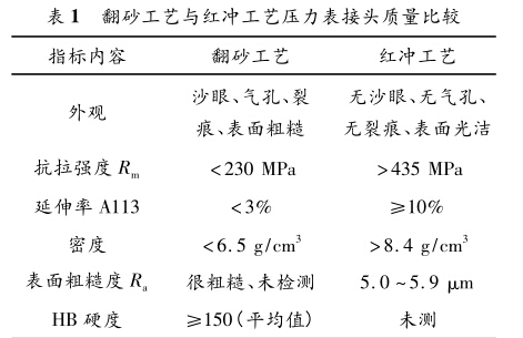 1)與翻砂工藝相比,紅沖工藝生產(chǎn)的壓力表接 頭質(zhì)量明顯提高,兩種工藝生產(chǎn)的壓力表接頭質(zhì)量 比較見表1。
