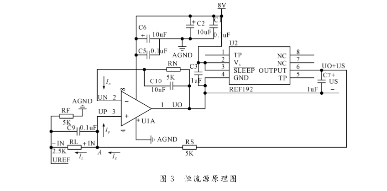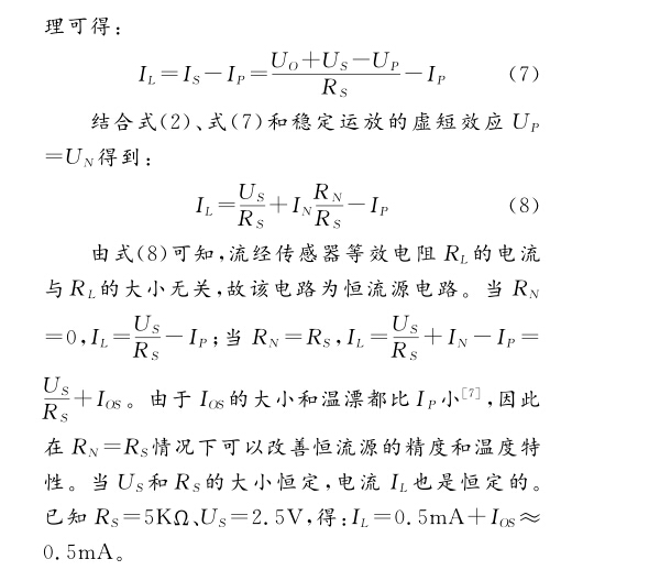 由式(1)可知恒流源的精度和穩(wěn)定性會(huì)影響壓力 傳感器輸出信號(hào)的質(zhì)量,因此對(duì)恒流源的精度、溫漂和 噪聲提出了要求。王金晨設(shè)計(jì)的恒流源中[4],負(fù)載懸 浮使噪聲增加。陳笑風(fēng)構(gòu)造的的電流源結(jié)構(gòu)[]復(fù)雜, 電阻難以匹配。本文設(shè)計(jì)的恒流源為負(fù)載接地恒流 源,具有精度高、溫漂小、結(jié)構(gòu)簡(jiǎn)單、無(wú)需電阻匹配、噪 聲低等特點(diǎn);考慮了運(yùn)放的正向端、負(fù)向端輸入電流的 影響;輸出了 A/D轉(zhuǎn)換器的參考電壓。