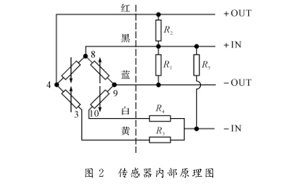 圖2傳感器內(nèi)部原理圖 恒流源電路原理如圖3所示。REF192為高 精度、低溫漂的帶隙參考電壓芯片,正常工作時(shí)其 OUTPUT引腳與GND引腳之間電壓差為2. 5V; Rs為5Kn的低溫漂電阻是壓力傳感器的等效 電阻;RF是5Kn的低溫漂電阻,一方面其兩端的電 壓作為A/D轉(zhuǎn)換器的參考電壓,另一方面使壓力 傳感器輸出信號(hào)的共模電壓滿足后續(xù)A/D測(cè)量的 要求R是普通電阻;C9、C10是濾波電容。下面 對(duì)該電路的直流狀態(tài)進(jìn)行分析。