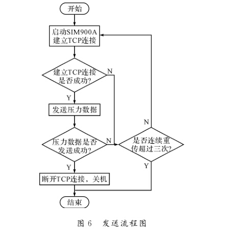 采用SIM900A通過(guò)GPRS網(wǎng)絡(luò)發(fā)送數(shù)據(jù)的過(guò) 程:首先設(shè)置網(wǎng)絡(luò),與服務(wù)器建立TCP連接;然 后單片機(jī)發(fā)送壓力數(shù)據(jù);發(fā)送完成后,關(guān)閉該TCP 連接減輕服務(wù)器的負(fù)擔(dān)。由于無(wú)線網(wǎng)絡(luò)不穩(wěn)定,會(huì) 出現(xiàn)連接不上、中途掉線和TCP握手超時(shí)等現(xiàn)象,因此需要設(shè)置重傳機(jī)制。發(fā)送流程如圖6所示,采 取的措施是連續(xù)三次出現(xiàn)數(shù)據(jù)發(fā)送不成功就關(guān)閉 SIM900A,等到下次發(fā)送時(shí)刻到來(lái)繼續(xù)發(fā)送。