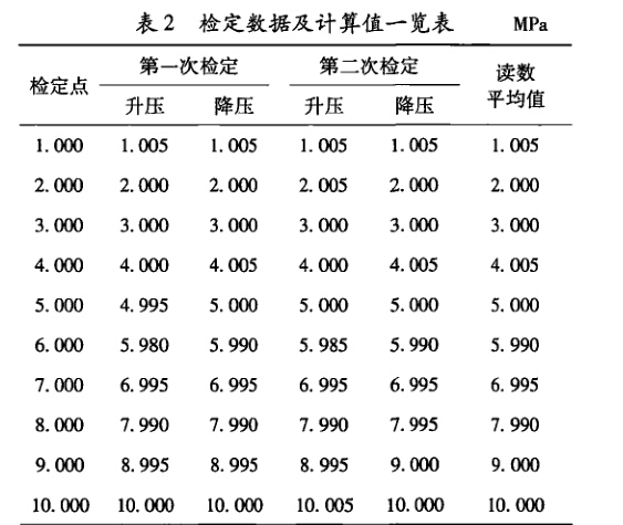 在本次檢定實例中,采用數字壓力計作為測量標 準。考慮到檢定中選用的數字壓力計準確度等級為 0.05%FS,測量范圍為0~ 10 MPa,在檢定范圍內服從