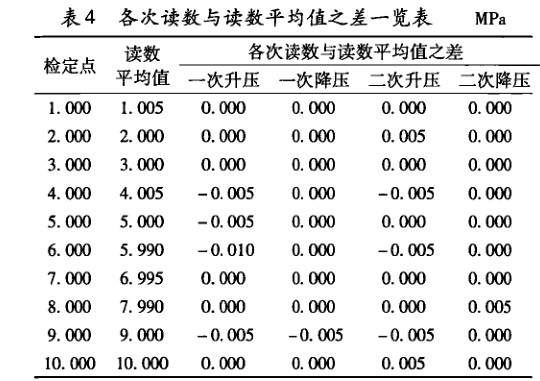 根據規范測量中合并樣本標準差的概念,首先計 算出表2中被檢精密壓力表各點讀數與其平均值之差, 如表4。