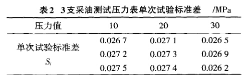 任意選取3塊同類(lèi)型的采油測(cè)試壓力表,每塊 在30、20、lOMPa連續(xù)測(cè)10次,共得9組測(cè)量列,每 組測(cè)量列分別按公式(1)計(jì)算得出的單次試驗(yàn)標(biāo)準(zhǔn) 差,如表2所示。