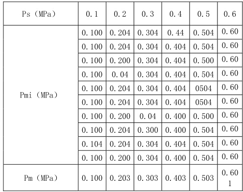 Ps——6組測(cè)量點(diǎn)壓強(qiáng)標(biāo)準(zhǔn)值’讀取自數(shù)字壓力校驗(yàn)儀 Pmi——每個(gè)測(cè)量點(diǎn)單次測(cè)量的示值’讀取自被檢表 Pm——每個(gè)測(cè)量點(diǎn)10次測(cè)量的示值算術(shù)平均值’根據(jù) 檢定規(guī)程修約到最小分度值1/5