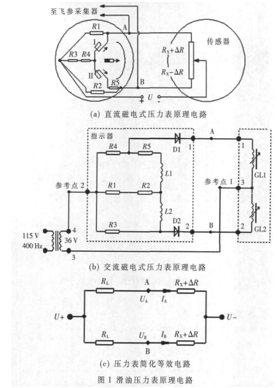 滑油壓力由壓力表系統進行測量指示,該系統是一 種二線磁電式儀表系統,由壓力傳感器和指示器構成, 原理電路如圖1所示。圖1(a)是直流磁電壓力表原理電 路,圖1(b)是交流磁電壓力表原理電路,系統中的傳感 器在油壓作用下改變指示器中兩個工作線圈的電流比 值,此電流比與滑油壓力成一定函數關系,而指示器中 指針的轉角與該電流比也成同樣的函數關系。現在飛機 所裝備的飛參記錄設備利用測量(圖1中A、B兩點)電 壓的方法來計算滑油壓力,從多年來的使用情況看,飛 參記錄的滑油壓力值誤差很大,嚴重影響了發動機工作 性能的正確判定。從壓力表的工作原理可知,用A、B兩 點的電壓計算滑油壓力,此方法存在原理性錯誤,因此, 必須對其進行改進,才能保證滑油壓力的準確測量。