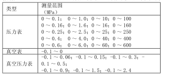 1、為了保證壓力表彈性元件能在彈性變形的安全范圍內(nèi) 可靠地工作,壓力表量程的選擇不僅要根據(jù)被測壓力的大小, 而且還應(yīng)考慮被測壓力變化的速度,其量程需留有足夠的余 地。使用壓力表測量穩(wěn)定壓力時,最大工作壓力不應(yīng)超過量 程的2/3;使用壓力表測量脈動壓力,最大工作壓力不應(yīng)超 過量程的1/2;使用壓力表測量高壓時,最大工作壓力不應(yīng)超過量程的3/5。為了保證測量準(zhǔn)確度,最小工作壓力不應(yīng) 低于量程的1/3。按此原則,根據(jù)被測最大壓力計算出一個 數(shù)值后,從壓力表產(chǎn)品目錄中選取稍大于該值的測量范圍。 根據(jù)GB/T 1226-1999《一般壓力表》的規(guī)定,壓力表測