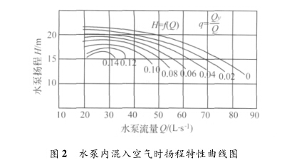兩表讀數特征:真空表和壓力表讀數都比正常時小 且常常不穩定嚴重時甚至降到零。其原因是泵內進入空氣 之后,壓頭顯著降低流量也急劇下降。水泵中混入少量空 氣有可能會正常工作但不同水泵可引入的空氣量都有一定 的限量引入太多則會使吸水管中水流中斷。水泵中混入空 氣與排水量在不同比例時的壓頭特性曲線如圖2所示,從圖 2中明顯看出水泵內混入空氣對壓頭特性的影響。