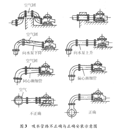另外,吸水管和水泵安裝不正確,使吸水管最高處不 能完全充滿水,有空氣憋在里面,泵也有可能不能正常工 作,吸水管與水泵不正確和正確的安裝方法如圖3所示。