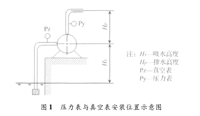 壓力表與真空表安裝位置示意圖如圖1所示,根據礦 井排水系統工作原理可知水泵出口壓力表和進口真空表 的讀數值分別可以寫成: