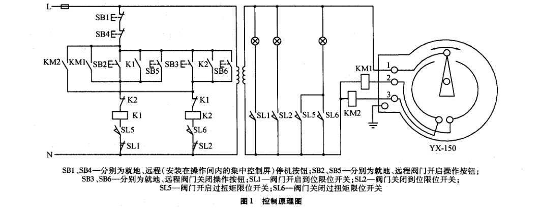 電動閥門基本控制原理是利用可逆式磁力啟動 器實現對閥門驅動電動機的正反轉控制,以達到對 閥門的開啟、關閉和停止操作。這種工作方式主要 依靠操作人員的經驗實現對閥門的控制。在開啟閥 門時很容易形成水泵長時間零流量運行帶來不必 要的電能消耗。在關閉閥門時很容易形成水錘,縮 短水泵的使用壽命。利用YX - 150電接點壓力表 不需要太大投資便可實現水泵與閥門的聯動,從而 解決上述問題。