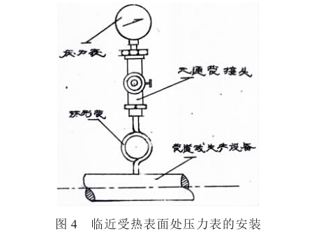 (6)壓力表不應(yīng)該直接安裝在臨近鍋爐以及類似設(shè) 備表面受熱的地方使用,若需要安裝在這些地方使用的 壓力表,其壓力表與管道相接之間必須要通過環(huán)形管和 三通管接頭,如圖4所示。