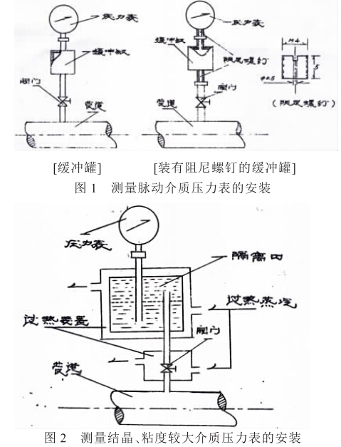 (2)被測(cè)介質(zhì)急劇變化或?yàn)槊}動(dòng)壓力時(shí),應(yīng)附加緩 沖罐或阻尼螺釘。如圖1所示,若需測(cè)量結(jié)晶或粘度較 大的介質(zhì)時(shí),需安裝隔離器,并應(yīng)設(shè)有過熱蒸汽裝置,如 圖2所示。