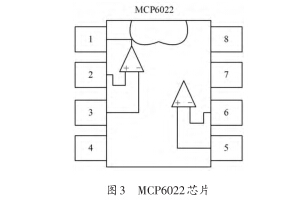 放大器電路主要采用的是MCP6022芯片,內部結 構如圖3所示。MCP6022是高性能的軌對軌輸人/輸出 運算放大器,帶寬為10 MHz,噪聲為8.7(10 kHz),低失 調電壓為±500~ ±250 pV總諧波失真為0.000 53%,電 源電壓范圍為2.5 - 5.5 V,滿足系統的設計要求。