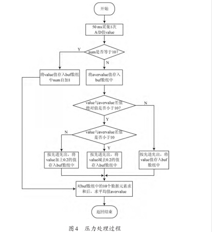 為了保證采集的壓力數據在壓力表上能夠顯示穩 定,波動范圍較小,滿足能夠外界壓力變化下壓力值的 連續變化,并且消除由于一些干擾引起的采樣值的偏 差,需要設計對應的壓力采集處理算法' 壓力處理過 程如圖4所示。