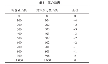 經過實驗測試,在5 V穩壓電源供電下,設計使用 量程在1 000 kPa下,采用3點標定校準的情況下,數字 壓力表顯示的數據跳動范圍為1~4 kPa數據顯示較為 穩定,能夠達到0.5級的精度要求。如表1所示的壓力 數據。