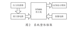 本系統的整體框圖如圖2所示,系統主要包括了 STM8S單片機模塊和外圍電路,外圍電路有液晶顯示模 塊、按鍵電路以及放大器電路。系統電源供電采用5 V的穩壓電壓。
