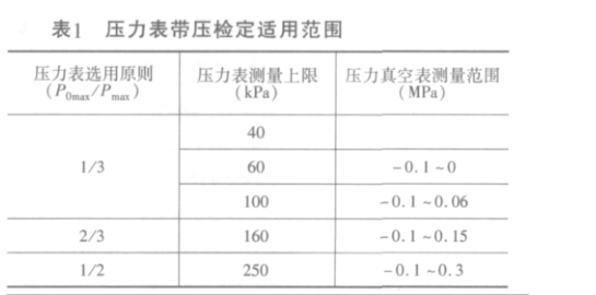 據壓力表、壓力真空表系列可知,壓力表最大上限 為0.25MPa;壓力真空表最大測量范圍為(-0.1 ~0.3)MPa 各選用原則可檢最大上限如表1所示。
