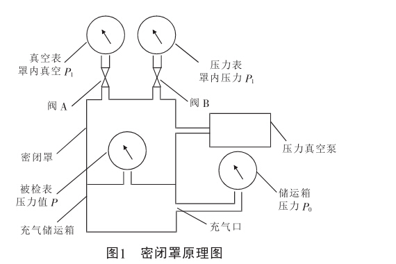在圖1中,P是被檢壓力表標稱值;A是密閉罩內 產生的壓力或真空標準值(簡稱罩內壓力真空值);A 是儲運箱內原有壓力真值,P。可用與標準器同準確度 的測量儀從儲運箱充氣口測得。由測量儲運箱內部壓 力而泄漏造成的儲運箱氣壓改變如不超過規(guī)定范圍, 可以不予考慮。圖1中真空表、壓力表是用來測量密閉罩內真空度及壓力標準值的。