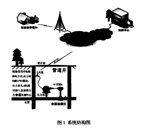 該系統主要由監控中心、通信網絡、GPRS/CDMA無線壓力 表、測量儀表組成。監控中心包括計算機及管網監控系統軟件r 通信網絡是基于移動或者電信的通信網絡平臺。GPRS/CDMA無 線壓力表是直接把無線壓力表安裝在管道上,通過GPRS/CDMA 網絡傳輸到監控中心,如現場能提供電源可選擇RTU產品,如現 場不便供電則可選擇電池供電無線壓力表。測量儀表主要包括 流量計和余氯、壓力變送器等。該系統的結構如圖1所示。