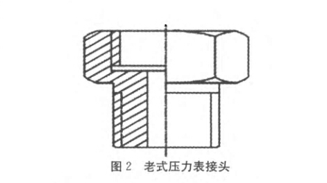 在原油生產過程中,壓力表通常通過閥門、壓力表接 頭安裝在油管上(見圖1 ),閥門起到截斷作用。由于壓力 表下部通常為M 20X1. 5螺紋,閥門為相應直徑的管螺 紋,壓力表接頭起變螺扣連接作用。實際工作中,當閥門 擰開后,壓力通過閥門、壓力表接頭內通道傳給壓力表,通 過閥門截斷更換壓力表。舊的壓力表接頭(見圖2)僅作為 閥門與壓力表之間的一個變螺扣連接,無自動控制,當壓 力表表被拆下后,如果閥門被開啟,油管內的液體將毫無 阻礙地流出,造成大量的液體泄漏。不法分子就是通過擰 下壓力表打開閥門偷油并造成大面積泄漏污染環境的。 因此,通過在壓力表接頭上想辦法設計一種具有自動控制 的壓力表接頭能有效地防止失竊和污染。