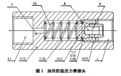 本文所述具有防盜功能的油田防盜壓力表接頭由 外殼、壓簧、閥芯、閥座、T型圈組成(見圖3 )。