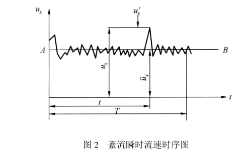故有:Ux = Ux + Ux 式中:Ux為瞬時流速;U X為該點在X方向的脈動流 速,隨時間變化;Ux為該點x方向的時均流速,從圖 形上看,Ux是T時段內與時間軸平行的直線AB的縱坐標。