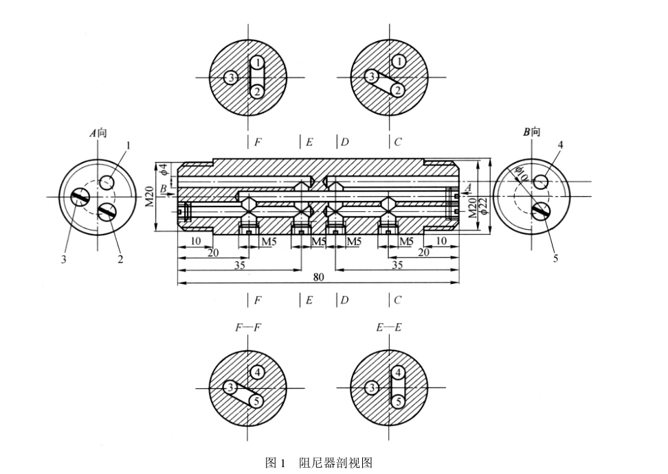 力口工方法:以安裝在接頭直徑為<22的壓力表 上長為80mm的阻尼器為例。其剖視圖如圖1所 示。在端面A上按等邊三角形的三個頂點位置鉆 三個直徑約4mm的孔1、、,孔1、深約35mm,孔 3深約60 mm ;在棒的另一端面B上,對應孔1、的 位置鉆相同孔徑的圓孔4、,深約35mm;在距4端 面約20mm處的側面鉆孔將孔2、溝通,在距4端 面35mm的側面鉆孔,將1、溝通;同理,在距B端 面20mm的側面鉆孔,將3、5溝通,在距B端面 35mm的側面鉆孔,將4、溝通。然后再堵上所有 的側面孔及孔2、、,再在其兩頭套扣之后,便制成 了簡易的阻尼器。將其安裝在泵出口管線與壓力表 接頭之間即可。