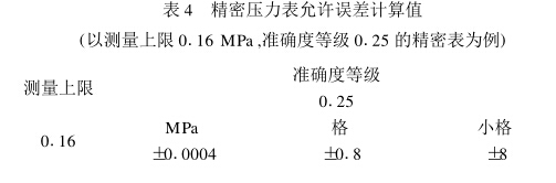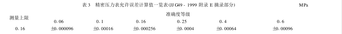 JJG49 - 1999附錄E “精密壓力表允許誤差計算值 一覽表”(表3為該一覽表的摘錄部分)中的允許誤差計 算值位數太長,實際操作中很不方便。在工作過程中,根據每塊表的具體情況可作相應的改進。即根據每塊表不 同的分度值,將“允許誤差計算值”一欄的計量單位由 “MPa”轉化為“格”或者“小格”。時間長了,常用的精密 壓力表都可以轉化出來,用起來很方便。