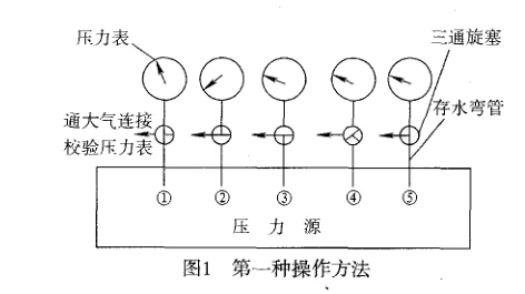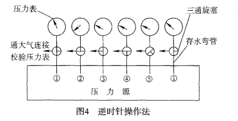 4)位置④壓力表連通大氣時的位置,即是檢查 壓力表指針是否在零位時的位置:壓力源被隔斷,壓 力表與大氣相通,壓力表指針應回到零位。否則,判 定該壓力表已失靈。