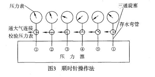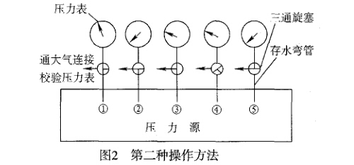 2)旋塞在位置②時,壓力表通外界大氣,若壓 力表正常則表上指針會退到零位。檢查完畢后,(旋 塞回到①位置),看壓力表指針是否能回到原壓力 讀數處。
