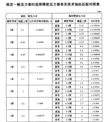 精密壓力表技術指標匹配對照表