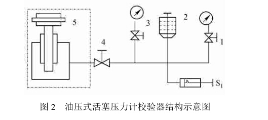 圖2為油壓式活塞壓力計校驗器結構示意圖。 制作時,選一臺不小于6MPa油壓式活塞壓力計校 驗器(筆者選擇的是西安儀表廠早期生產的活塞壓 力計校驗器),將標準活塞壓力計(包括連接座)和連接控制閥4之間的管子拆下,如圖2虛線部分,再把 油杯2拆下,然后在油杯拆下的連接座上裝一控制 ,如圖1中2所示,再根據壓力校驗器的空間位 ,按圖1所示位置安裝氣液隔離器、放氣閥和活塞 壓力計及其連接管子。各部件安裝前,要對系統管 路進行無油脂清洗,安裝完畢后,對整個系統要進行 使用壓力范圍的氣密壓力試驗檢查,合格后方可使 用。