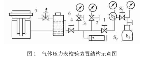 檢定壓力表的示值,按照JJ G49 一1999《彈簧管 式精密表和真空表》國家檢定規程的要求:“測量上 限值不大于0. 25MPa的精度表,工作介質為清潔的 空氣或無毒、無害和化學性能穩定的氣體,測量上限 值不大于2. 5MPa實際是用于測量氣體壓力的精密 表,檢定時也用氣體作工作介質我們發現,在實 際使用中,如果精密表是用來測量氣體壓力,而檢定 時卻用液體作工作介質,由于兩者介質之間密度差 異較大,將會帶來附加的誤差。實驗證明,上限值為 1. 6MPa0. 4級的精密表,用空氣與變壓器油作介 質進行示值檢定時,空氣檢定的示值普遍要比變壓 器油檢定的示值大,其最大差值有時接近于儀表的 允差。而且壓力表的量程越小,兩種介質的示值差 對于滿刻度的百分數就越大,量程越大,這個百分數 值就越小。對此,我們用油壓式活塞式壓力計校驗 器進行改動,制作測量氣體壓力在4MPa的氣控壓 力表檢定裝置,經使用多年,效果很好,現介紹如下。